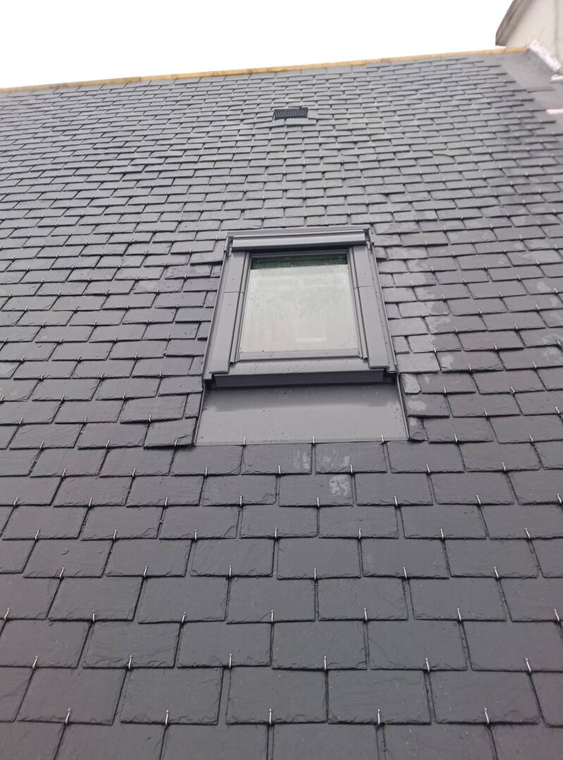 Réfection totale d'une toiture ardoise, 2 velux sur chaque rampant, faîtage, chatière et gouttière zinc.