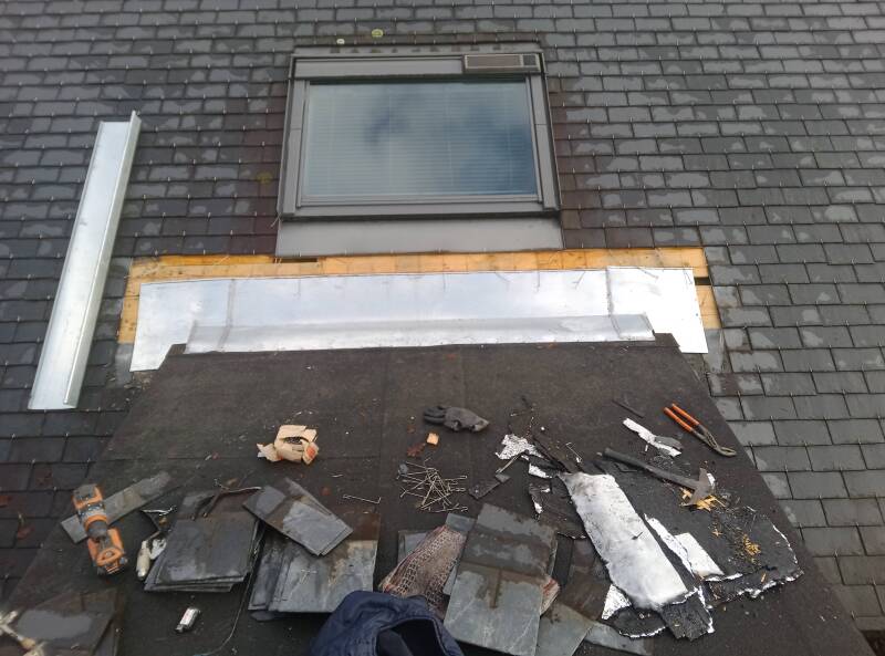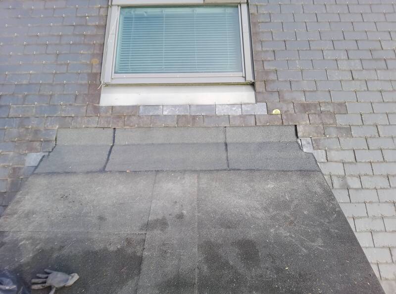 Reprise d'un raccord entre une toiture étanchéité bitumineuse et une toiture ardoises.